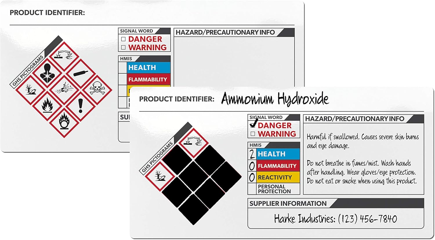 GHS Container Labels | EHS - Anschutz Medical Campus The sample container label for acrolein below, shows the required elements for chemical labels under the GHS standard. What items are on a container label? Product Identifier (chemical name) - Must match the Product Identifier (chemical name) listed on the safety data sheet. Signal Word - Only Danger (severe) or Warning (less severe) can be used. GHS Labeling Requirements: The Definitive Guide [2021 Update ... - Luminer What Does GHS Stand For? GHS stands for Globally Harmonized System of Classification and Labeling of Chemicals. It is an internationally-recognized standard for labeling containers that hold hazardous materials. Currently, more than 65 nations have adopted some version of these standards. PDF Chemical Labeling Guidelines - UGA 2.2 All secondary chemical containers can have a National Fire Protection Agency (NFPA) safety diamond affixed (see Attachment 1) 2.3 All secondary chemical containers must have a UGA‐URAR chemical label affixed (see Attachment 1), or other comparable labeling. , Chemical Container Labeling - Syracuse University Chemical Container Labeling. In accordance with OSHA's Hazard Communication Standard, manufacturers, importers or distributors of hazardous chemicals must follow specific container labeling requirements when their product are shipped in commerce. ... The University must ensure manufacturer container labels are maintained in good condition and ...