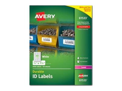 Avery® Durable ID Labels - Permanent Adhesive - 5/8" Width x 3" Length ... Permanent Adhesive - 5/8" Width x 3" Length - Rectangle - Laser - White - Polyester - 32 / Sheet - 1600 / Pack. Durable labels stand up to frequent use; Resists moisture, scuffing, tearing and smudging for professional-looking results; TrueBlock Technology completely covers everything underneath; Easy to customize with free online templates and ...